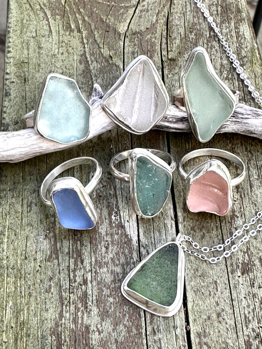 The collection also features authentic Beach Glass rings and pendants crafted with sterling silver and Lake Huron treasures, alongside Petoskey Stone connector charms perfect for custom length chain jewelry.