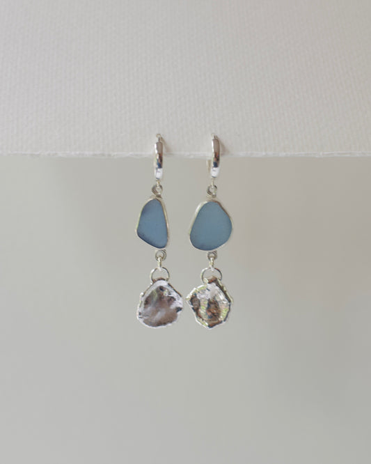 Dangle Earrings, Medium-Small Lake Formed Drops on with Beach Glass in .925 Sterling Silver Hoops, Custom Keepsake Inclusion Lake Formed