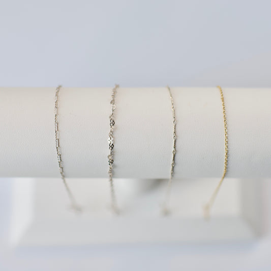 When selecting your perfect permanent jewelry piece, it's important to understand the varying strengths and characteristics that come with different chain and wire gauges. While all my pieces are made to be durable, the wire thickness used in each link can impact how delicate or sturdy the final chain will be.